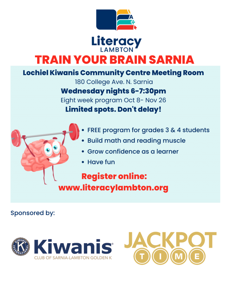 Sarnia Train Your Brain Registration Wednesday NightsOct 8 – Nov 266-7:30pmLochiel Kiwanis Community Centre Meeting Room180 College Ave N. Registration is now closed.